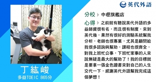 身為上班族的丁紘峻,並沒有太多時間可以進修,但為了想證明自己的實力,選擇到制度完善的英代外語充實英文能力,經過老師及顧問的協助下,讓他順利考取到多益金色證書,完成人生當中的一個里程碑。