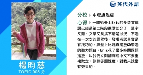 身為學生的楊昀慈在學習上展現出自己得積極態度,在英文領域不斷努力的她,除了考取全民英檢外,多益證照更是她想拿取的英文第二證照,而在英代外語幫助下,經過一段時間的磨練拿到905分,其中聽力還滿分的金色證書。