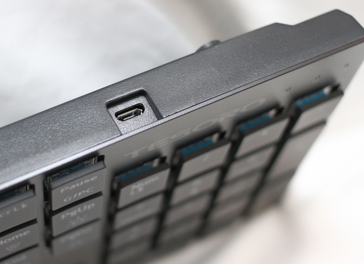 ▼ Micro USB的連接孔 設計於鍵盤的上部;也是整支鍵盤最厚的部份,但是厚度也只有 2.4公分。