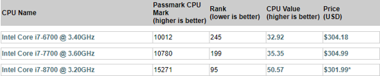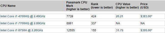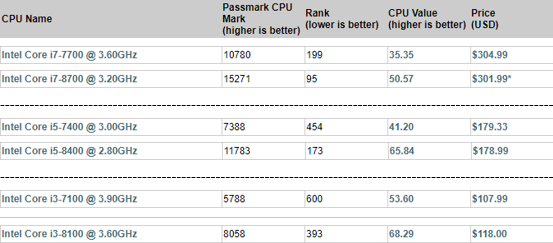 看到這樣的規格,我在想第 8 代處理器效能既然大幅提升,是否可以用第 8 代 i5 的處理器,取代第 7 代的 i7 處理器呢?所以往在網路上面查了一下跑分表: