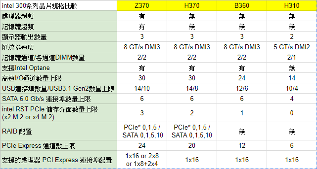 我提供一張 intel 300 系列的晶片規格表讓大家參考: