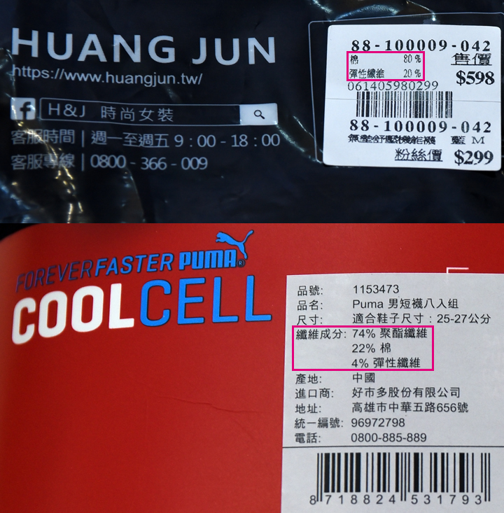 ▲ 可以看到HUANG JUN 使用80%的棉與20%的LYCRA彈性纖維,這些都算是高成本的材質,因此吸濕、排汗、拉伸應力、耐磨損性、耐老化性都比PUMA的好上幾倍。