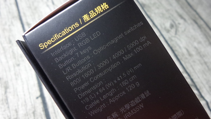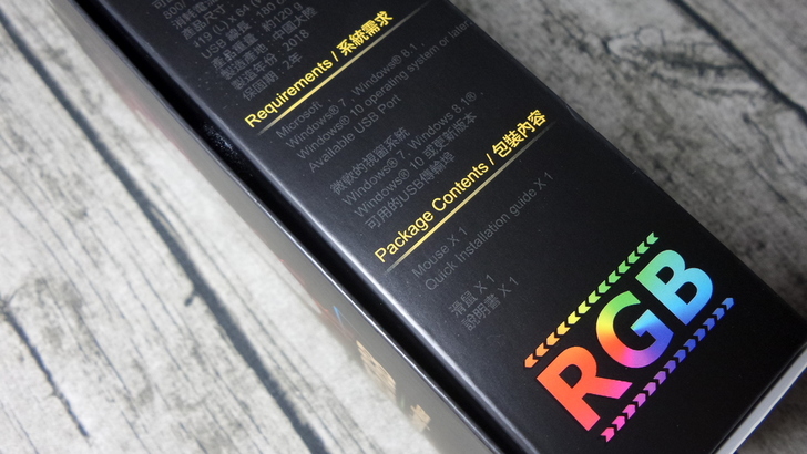 【▼】包裝彩盒的左側有隨插即用的系統需求與包裝內容物(鼠鼠本體與使用說明書),私心以為還會多送個滑鼠墊...XDDD