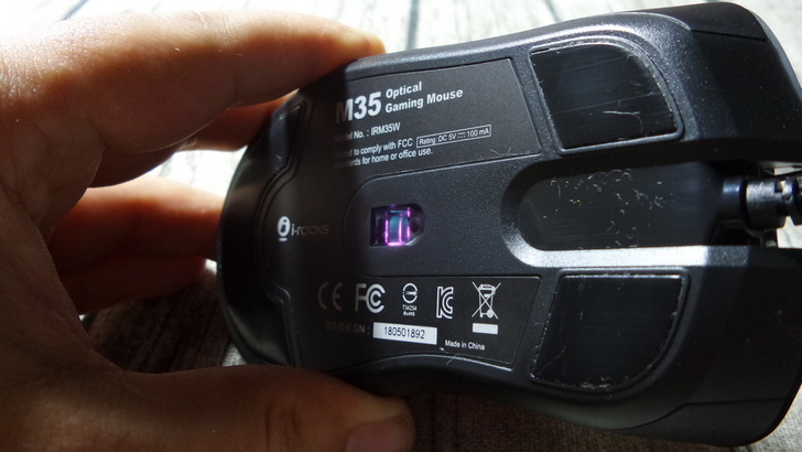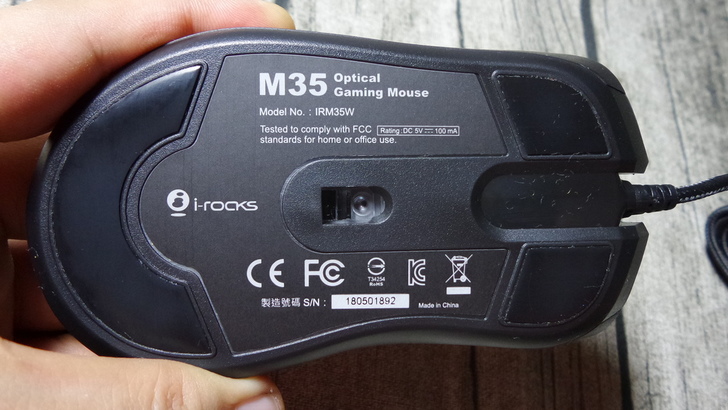 【▼】鼠底部分採用耐磨的鐵氟龍貼腳,分布在左右鍵下緣以及手根部,鼠腳平整順滑,中間為光學感應器,後過LED光源折射原理來運作。底部也印有一些像產品型號(IRM35W)、序號、製造產地(中國)、安規與額定電源(DCV=5V@100mA)的相關資訊。
