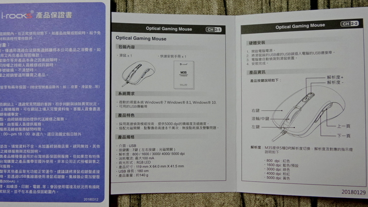 【▼】滑鼠說明書一般沒有人會看,大家都是買了直接插上USB,倒是不同解析度所對應的指示燈顏色可以記一下。