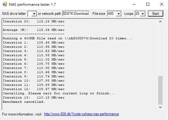 透過NAS Performance tester 1.7 測試存取效能,平均讀寫都有110MB/s 左右的效能表現~