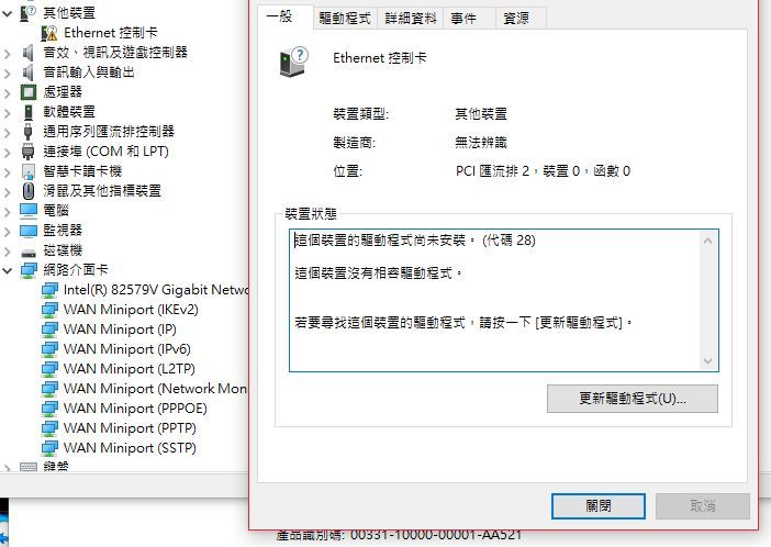 安裝上去之後無法自動取得驅動程式~