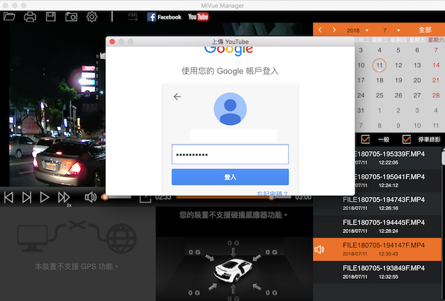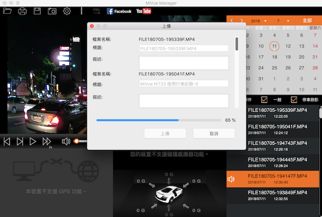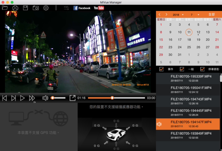 在電腦上(Windows、 Mac)可安裝MiVue Manager這個程式,來操作影片,比如存檔、截圖,或是上傳Youtube與 Facebook等,對於事後存取影片非常方便,且右上角月曆的日期下方若有黑點,表示該日有錄影,不過,需注意的是它是以影片存檔的日期為準,實際拍攝日期與時間還是要以影片中右下角的字幕為主。