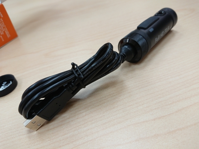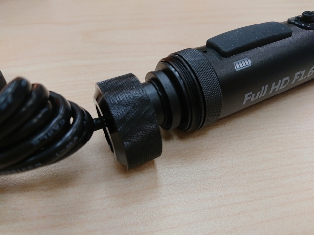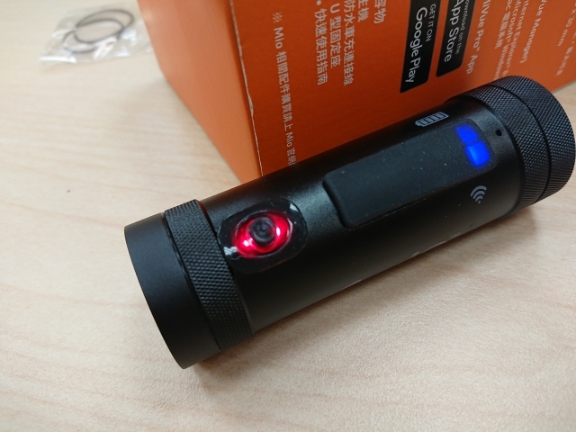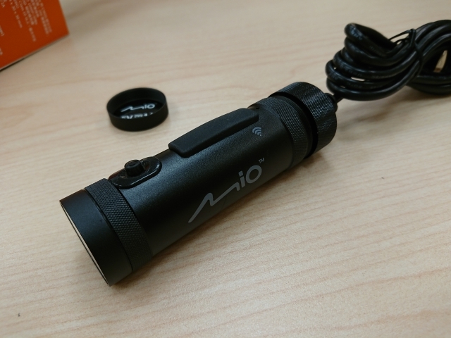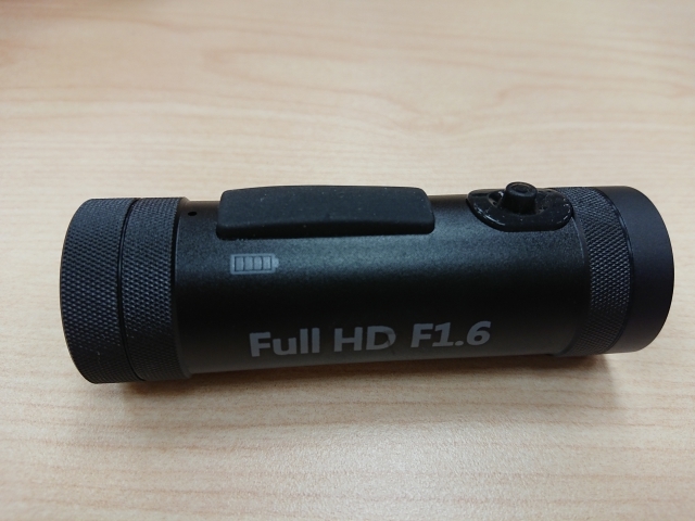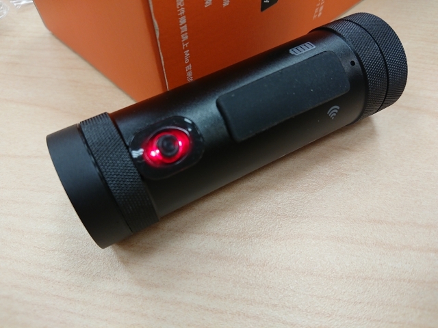 MiVue M733 本體不大,很像一般常見的迷你手電筒,只有一個按鍵,操作簡單也便於攜帶,側面印了強調Full HDc畫質與F1.6大光圈的字樣,電量圖示則是當機後上方會有燈號顯示。
