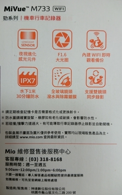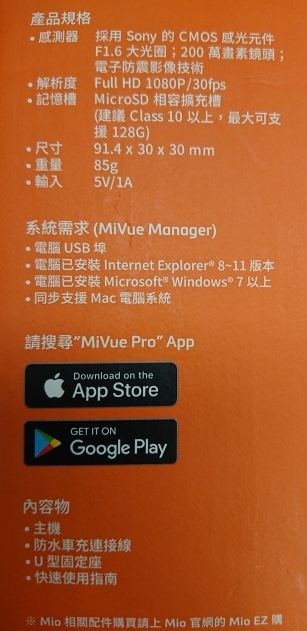 Mio MiVue M733 盒子非常小巧,外盒側面列出了MiVue M733 規格以及主要功能: