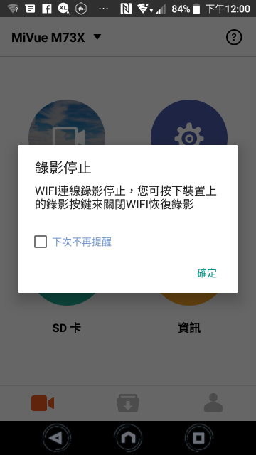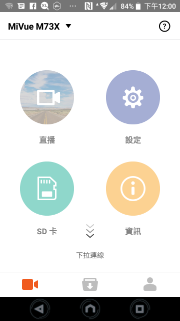 MiVue M733跟手機都開啟wifi,然後開啟MiVuePro後,依循Wifi設定即可完成與MiVue M733的連線,待機畫面如下,且如前所述,當開啟wifi後,即不可錄影,只可進行手機『直播』功能進行觀看。