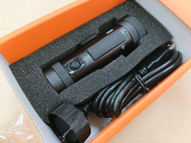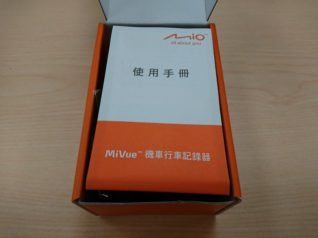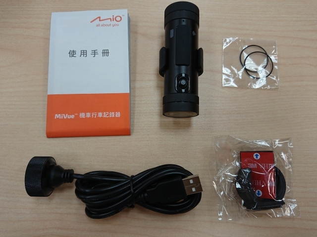 取出後,內容物有:使用手冊、 MiVue M733 記錄器、備用的防水墊圈、固定用高黏度子母扣、單頭防水車充連接線等。