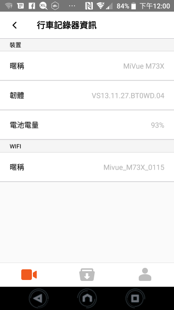 當點選『資訊』時,則會顯示MiVue M733 目前的名稱、韌體,以及很重要的電量等。