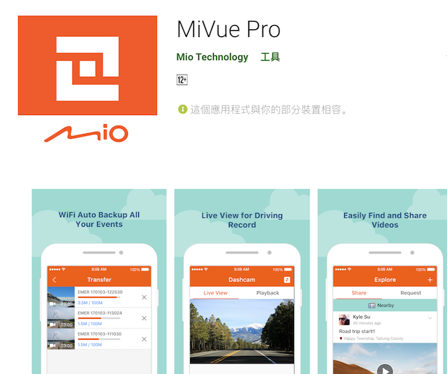 可惜這次未能測試到:支援前後最高畫質同步錄影這個功能,不過,以先前Mio MiVue車用Wifi行車記錄器的使用經驗,應該是類似,畢竟app都開發好了,後鏡頭同步錄影應該也是沒問題,只是這個後鏡頭是要選配倒是了。