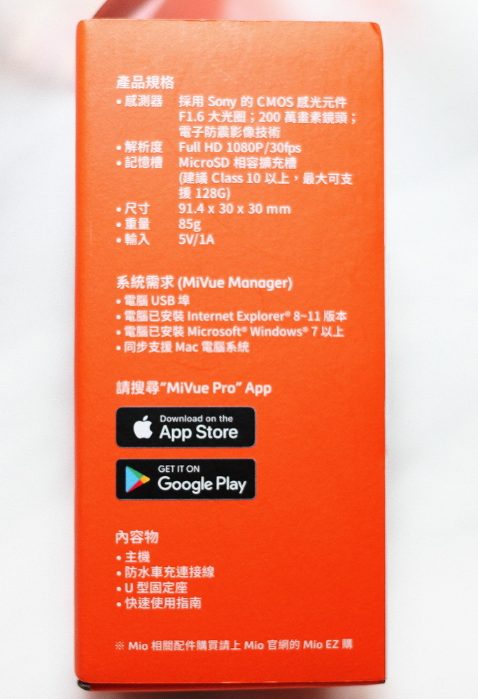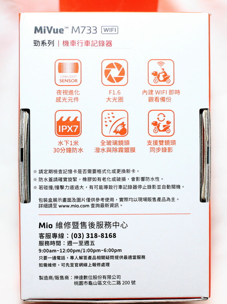 ▼ 盒裝背面:除了使用上的注意事項,也有圖示說明 MiVue™ M733 特色。