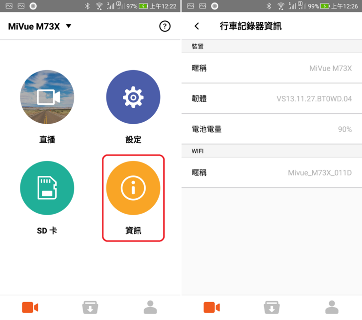 ▲ 點選 [資訊]後,可以看到目前的電量 / 韌體版本