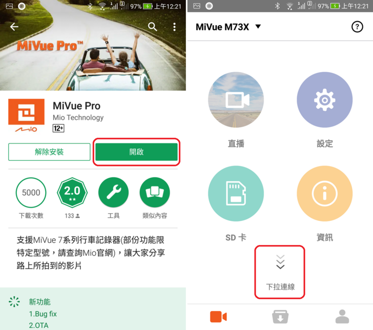 ▲ iPhone / Android 皆可下載 MiVue Pro APP使用,APP安裝完成後,點擇開啟即進入APP程式畫面,於螢幕下拉後就可以進行與M733主機連線