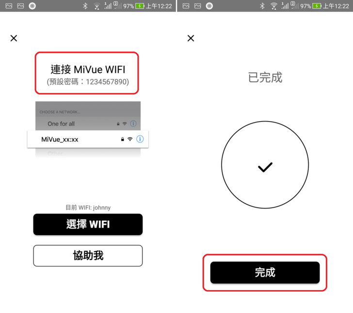 ▲ WIFI尋到 Mivue_M73X_XXXX後,輸入預設密碼1234567890,輸入完成後,即可完成連線