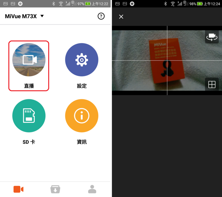 ▲ 連線成功後,主畫面圖式會變成彩色的,點選 [直播] 後,就可以直接看到M733鏡頭照到的畫面,讓鬆的將M733安裝到正確的角度