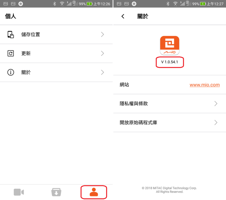 ▲ 點選下面的 [個人] ,可以更新韌體;點 [關於] 可以看到目前的APP為1.0.54.1版