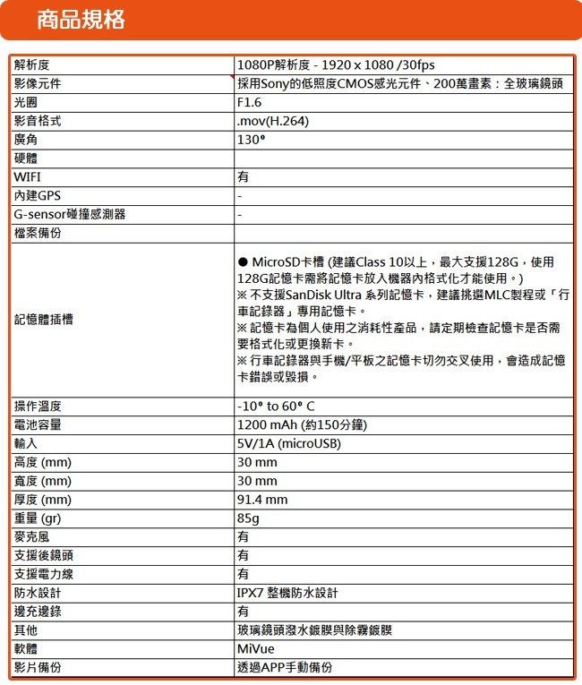 ▲ 規格介紹:使用了Sony 的感光元件 / 擁有F1.6的大光圈 / 可透過WIFI連接手機即時觀看影片檔 / IPX7認證,可於潛入水下1米深達到30分鐘防水功能 / 全玻璃鏡頭鍍膜,可防潑水與除霧功效 / 支援雙鏡頭,可另外購買後鏡頭安裝,同步錄影防止後車的追撞