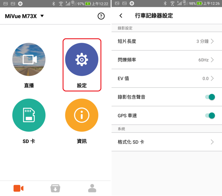 ▲ 點選 [設定]後,可以設定每段錄影的影片長度 / 閃爍頻率 / EV值 …等,並可以格式化SD卡
