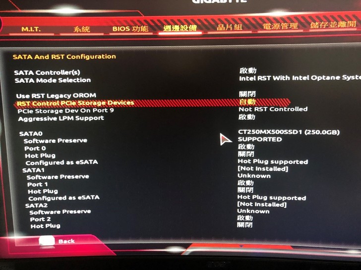 ▲PCIe Storage Dev On Port 9 Not RST Controlled無法選擇成RST Controlled ,後來把B360 AORUS GAMING 3 WIFI主機板說明書拿出看才發現,M.2插槽有分一個是16G一個是32G,我插在16G的上了所以改成32G的插槽就OK了。