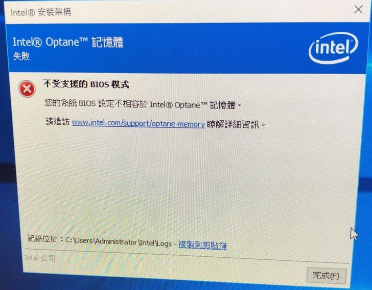 ▲沒有用UEFI/GPT分割技術要灌Intel® Optane™ Memory 的驅動就會顯示這個錯誤(不受支援的BIOS 模式) 。