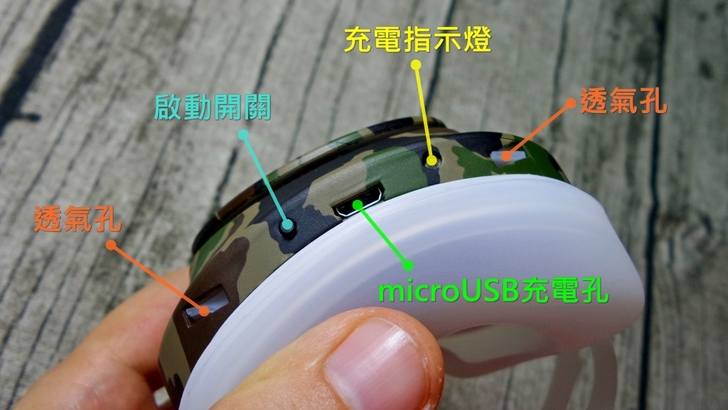 【▼】BMXrobot Genki元氣口罩型空氣清淨機各部位的功能,兩旁有主要呼吸的透氣孔,中間有作為充電的microUSB充電孔,而在充電孔右邊為充電指示燈號,左邊則是風扇的啟動開關。