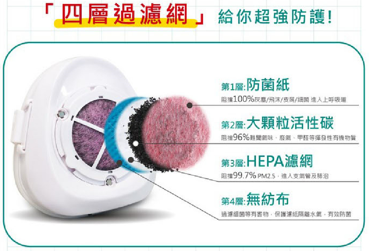 【▼】而四層過濾網藍色的部分是無紡布,主要功能是過濾細菌等有害物,保護濾紙隔離水氣,有效防菌。