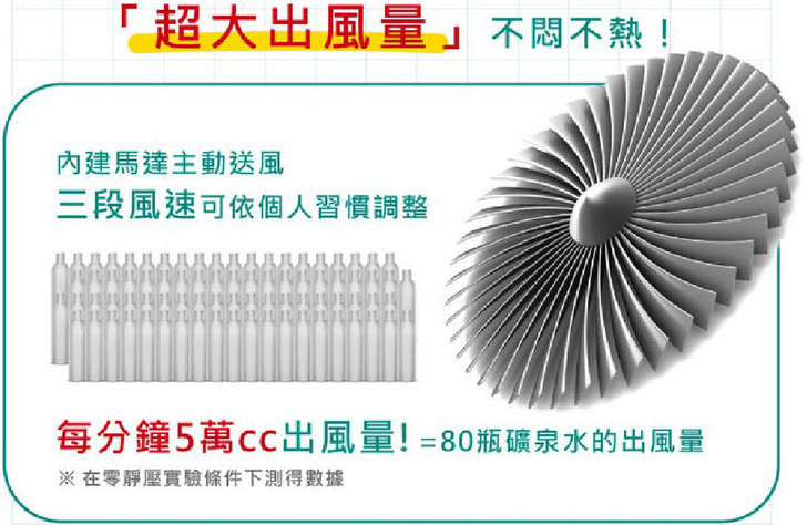 【▼】風扇的出風量在零靜壓實驗條件下,每分鐘測得5萬CC,相當於80瓶礦泉水,超大出風量,讓您夏天戴也不悶不熱。