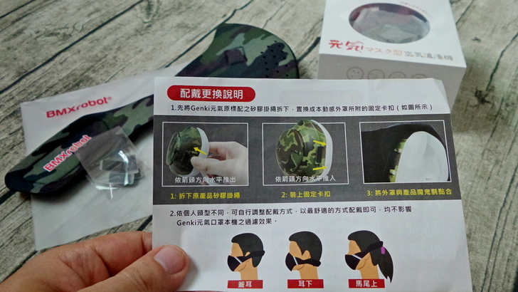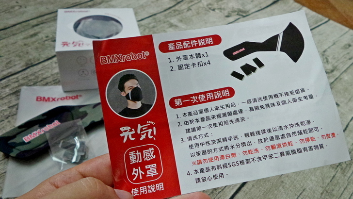 【▼】BMXrobot Genki元氣口罩型空氣清淨機介紹完之後,接下來來介紹 "動感外罩",之所以設計動感外罩,主要考量是現代人愛潮、愛時尚,老實說外觀重於防護效果,這動感外罩內有簡單的使用說明,包含配件有固定卡扣四片與外罩本體一套。