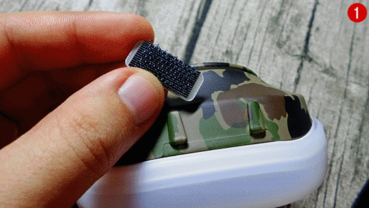 【▼】安裝步驟,將固定卡扣插於剛才矽膠套繩取下的凹槽內,記得魔鬼氈朝外,接著互黏動感外罩上的魔鬼氈,大功就告成囉~