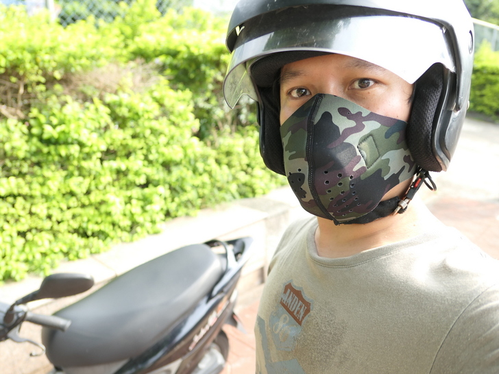 【▼】這是小编戴上安全帽配合只有動感外罩的模樣,老實說真的還蠻有型的,動感外罩對於3/4安全帽的穿戴影響不大。