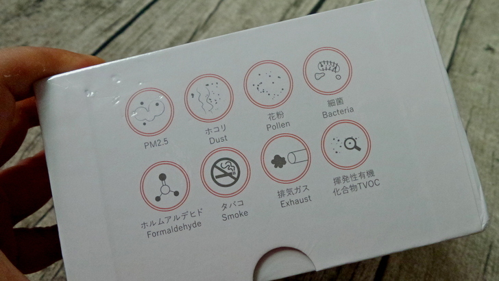 【▼】包裝側邊也說明這款口罩型空氣清淨機能有效阻擋PM2.5、粉塵、花粉、細菌、甲醛、煙毒、廢氣與揮發性有機化合物等八種有害氣體。