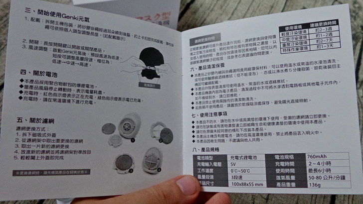【▼】使用說明書背面則為細部的使用方法,包含配戴方式、啟動步驟與三段風速調整。另外關於濾網更換的方式與清潔保養的時間也有詳細說明,最後附上產品規格