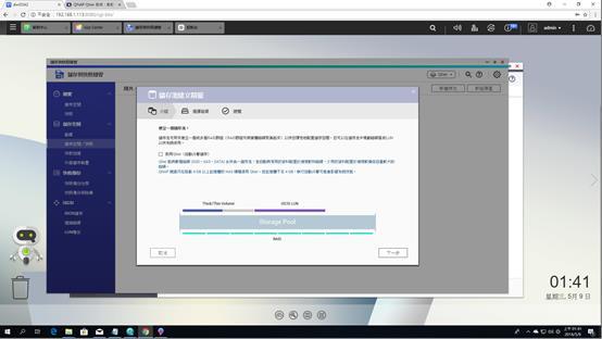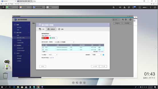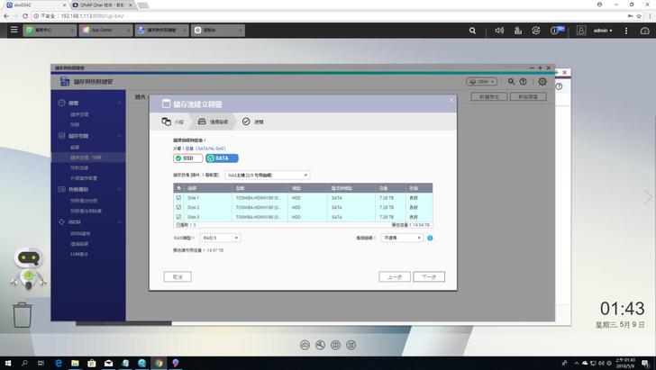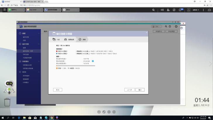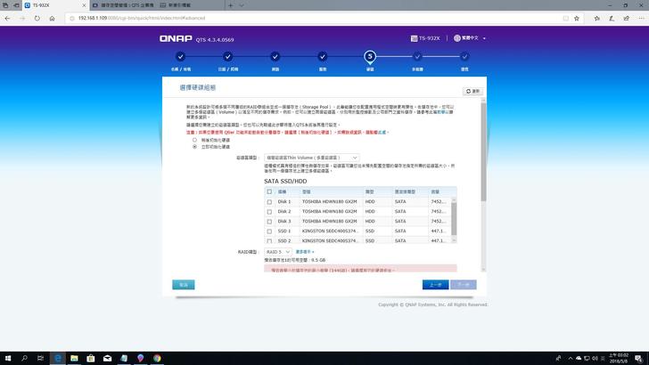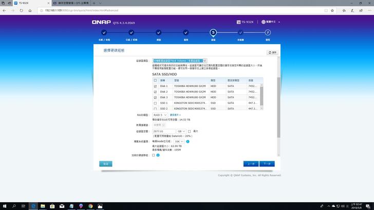 ▼跑完前面的設定後會到這個硬碟區設定,因為這次廠商提供三顆3.5HDD和兩顆2.5 SSD,分別可以組成RAID5和RAID1的配置,而Qtier得在之後系統安裝完才能使用,所以姑且先跳過