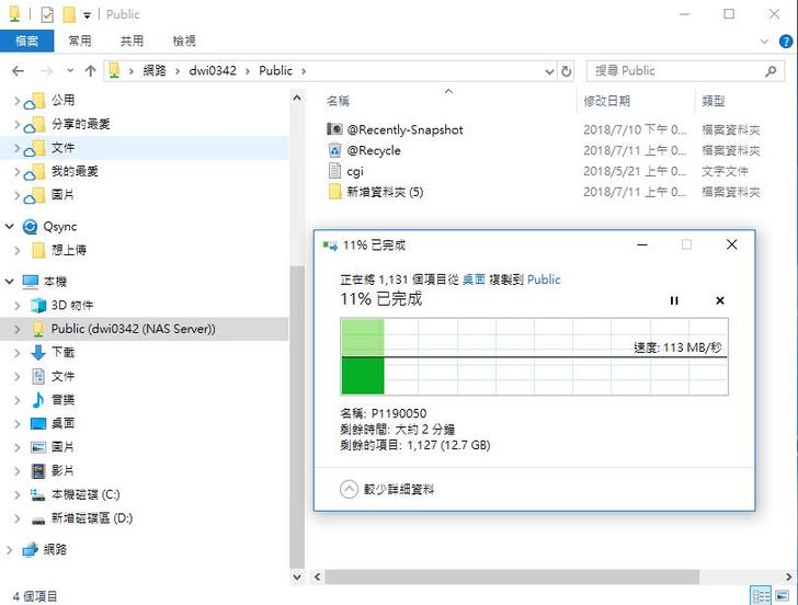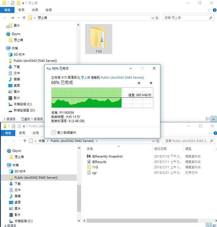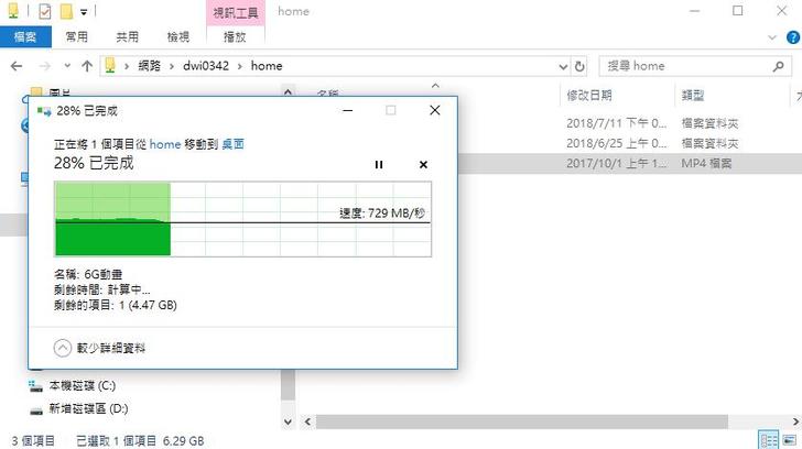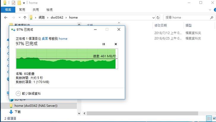 傳送單一檔案如6GB的影片,從NAS到PC的傳輸速度不僅穩定而且速度還不錯