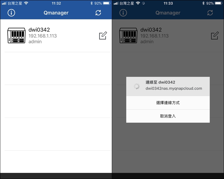 ▼點開程式以後,NAS很快就跑出來,點選連線方式並輸入NAS的使用者和密碼即可進去