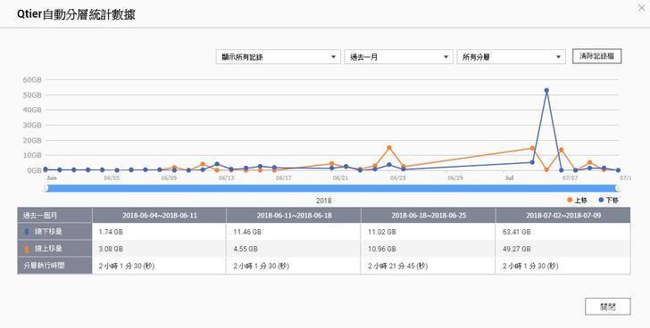 ▼從Qtier自動分層統計數據的時間線上來看,越接近的資料都在上端也就是熱處理部分居多,日期越遠且不常用的資料則會把放入HDD,可以檢視長達一個月的分層動態,紀錄常用的時段來設定排程也是相當方便