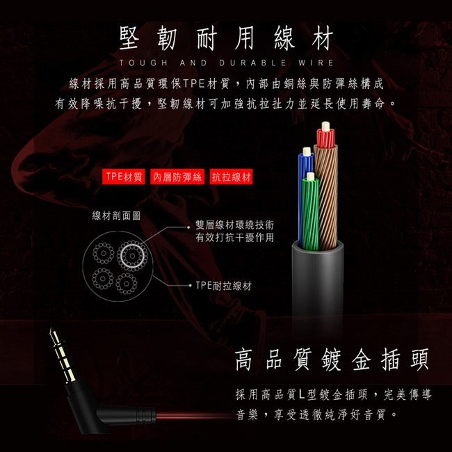 一般我們看到3.5mm的耳機插頭都是成90度直角,但我真的是第一次看到耳機插頭是有斜度的,而且很順手的插入耳機孔。此外,我們也很怕耳機拔來拔去,或是拉扯,線材也容易斷裂。但他們的線材由防彈絲及銅線構成,應該很耐操,不怕拉扯,增加壽命。