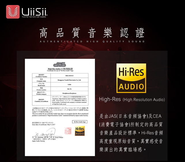 ▲為何要說Hi-Res呢?這次使用的UiiSii BA-T6耳機,就是有經過Hi-Res認證過的。