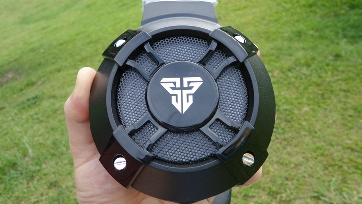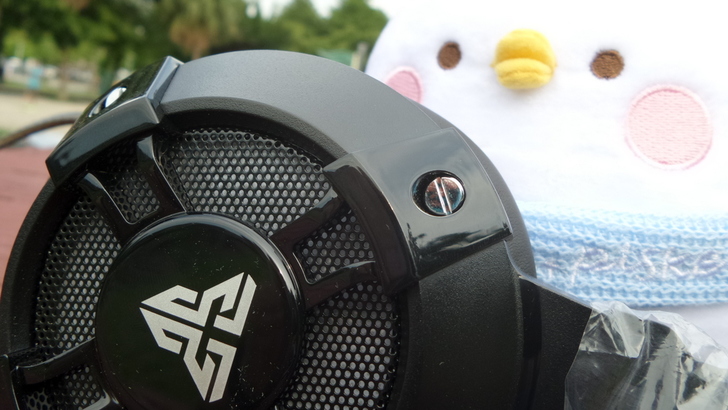 【▼】在HG11的耳罩外觀上,鏡面黑的金屬光澤與磨砂感的塑膠成型將5公分的大單體嵌入至交織成網的結構中,媲美X戰警的威猛氣勢,中間的Logoq頗像另一家電競廠商-狼派的Logo,整體散發出濃濃的科技感。