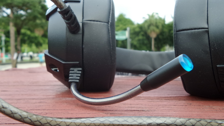【▼】左耳罩除了連接線材外,也掌管了麥克風的輸出,HG11的高靈敏降噪麥克風採金屬蛇管的造型,全長約有8公分,好彎曲、夠時尚,並在頭端設計有發光LED,夜晚呼叫隊友也沒有問題。