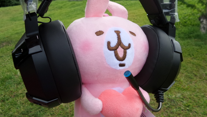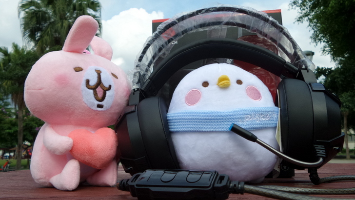 【▼】一天粉紅兔兔與P助在路上踢到一個巨大物品,兔兔一看不得了,是款電競耳機耶,而且右下角有這台電景耳機的特點,P助看了看包含了有舒適柔軟的耳罩、7.1環繞聲道的加持、取代3.5mm的USB輸入、科技感十足的線控盒與電競不能錯過的發光麥克風,再加上右上角有程式化的調校功能,讓粉紅兔兔的失心瘋又出來啦~