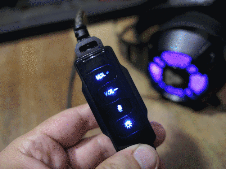 【▼】當把HG11電競耳機USB接頭接上電腦主機後,HG11線控盒的控制圖示會亮起,同時耳罩外觀也會發出RGB的呼吸燈效果。由發光的控制圖示可以知道VOL+為音量加大,VOL-為音量減小,麥克風與RGB炫光效果,音量調整的圖示會一直亮著,而麥克風圖示容易搞混,主要是它麥克風圖示上有多一個斜槓,一般人會以為亮起是關閉麥克風,這邊剛好相反,是亮起的時候,麥克風才有作用,最後的RGB炫光效果,當亮起時是開啟RGB效果,包含耳罩外觀與麥克風前端的照燈。