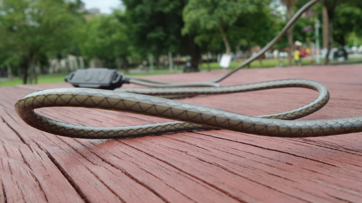 【▼】另外線的部分可好好討論,外表採用很像蛇皮的塑膠所包覆,成型形狀為正方體而非圓柱體,一樣有編織線不易打結的優點。
