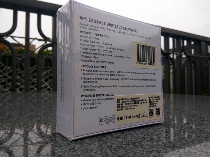 ▲包裝正面,可注前右上角的貼紙。Wyless Qi 鏡光無線快充通過WPC認證通過,也支援目前主要的手機二大系統, iOS與Android。