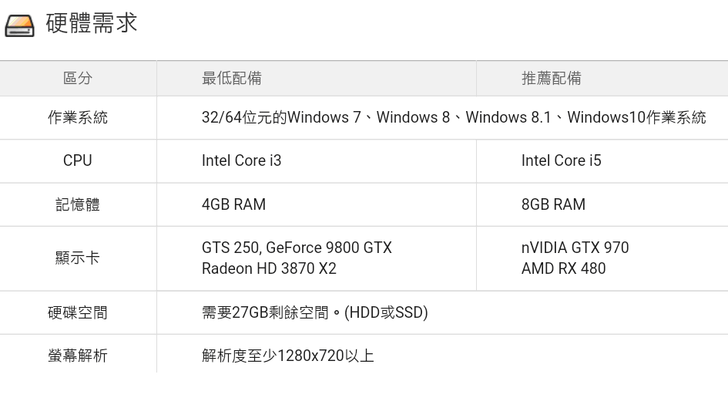 看了一下官方粉絲團釋出硬體的參考需求如下