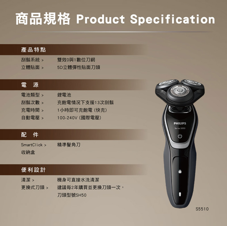 ▲S5510電鬍刀的5D立體彈性貼面,有5個方向的彎曲自由度,使用時可以貼合皮膚及臉部稜角的曲線,讓您刮的乾淨,刮得順暢。